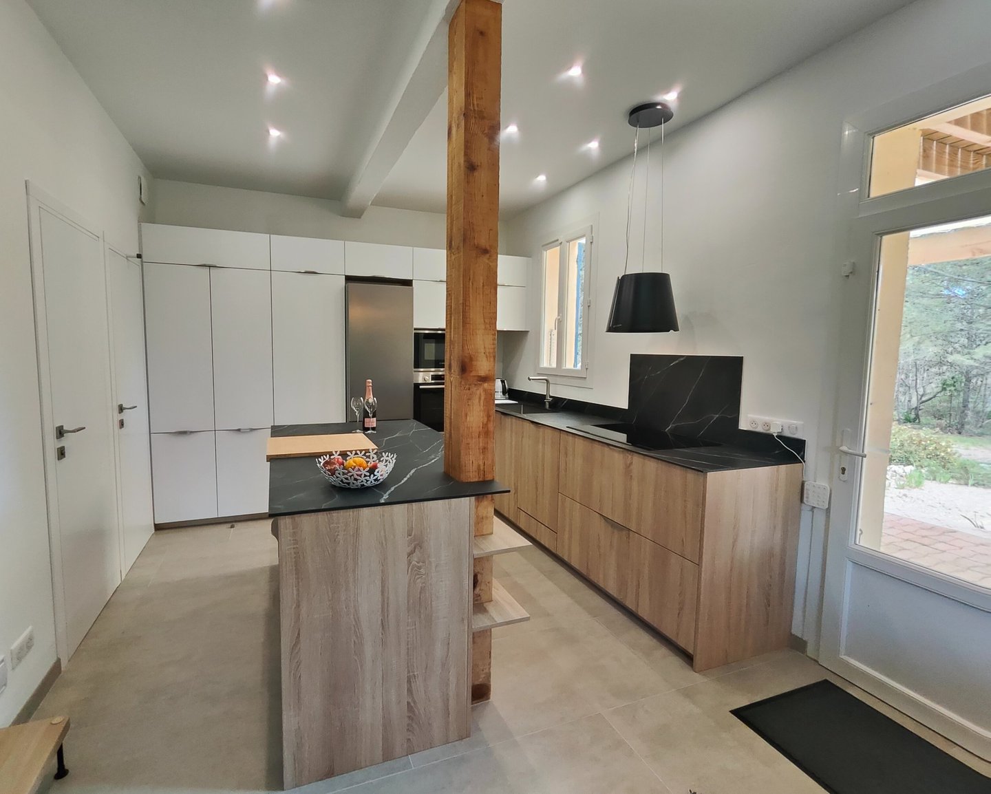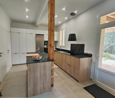 Une grande cuisine totalement équipée ; de grands placards et de vastes meubles à tiroirs, un ilot spacieux, des plans de travail en pierre, un grand frigo, une plaque à induction 5 feux, un four chaleur tournante, un micro onde, un lave vaisselle et une cave à vin dans laquelle des bouteilles de la région (et un peu de champagne...) sont mis à disposition "à discrétion" et à prix local.