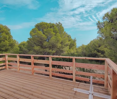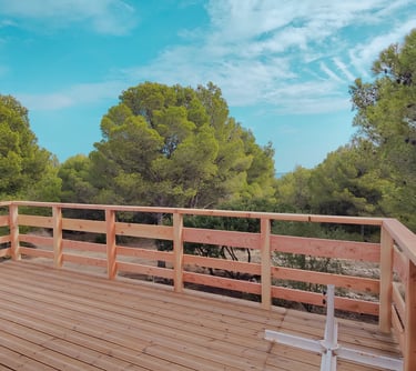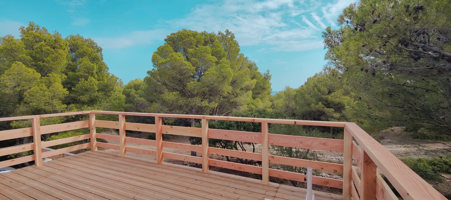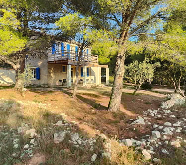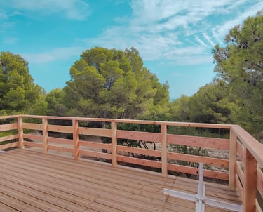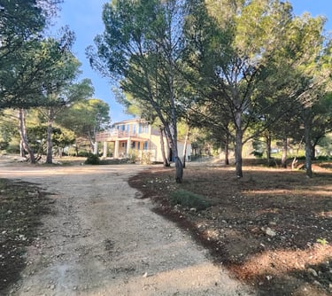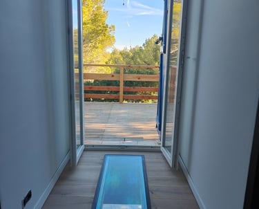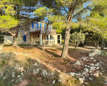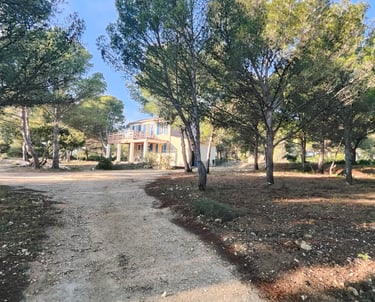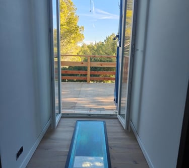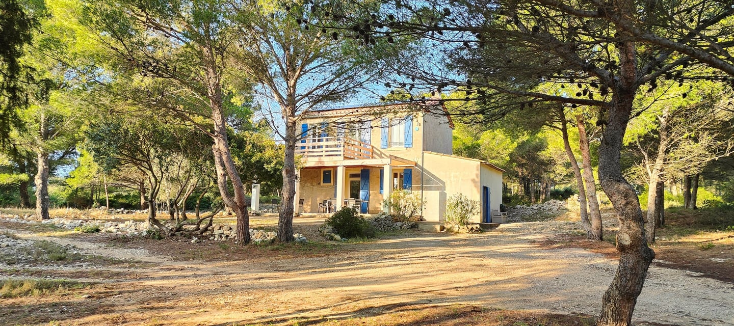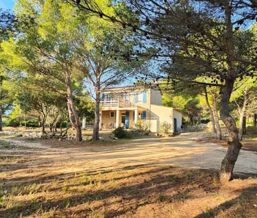A l'étage, un petit couloir donne l'accès à 3 chambres dont une master et à la grande terrasse bois ensoleillée avec vue sur la pinède, l'étang et la mer. Tout le sol est en plancher chêne, les cloisons doublées, les portes à charnières invisibles et à clenche magnétique, les plafonds et les mûrs totalement repeints et animés de tapisseries représentant les espaces naturels proches.