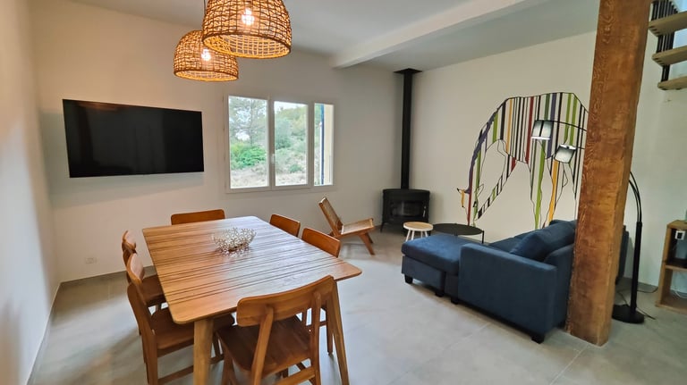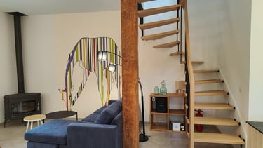 Au rez de chaussée, un vaste séjour (table conviviale) avec une jolie partie salon (canapé, fauteuil, poêle), confortable, un puit de lumière agréable, un escalier bois suspendu "léger".