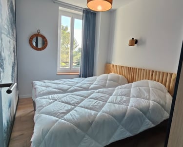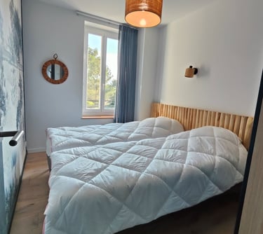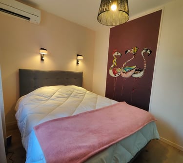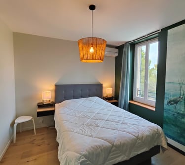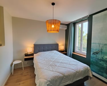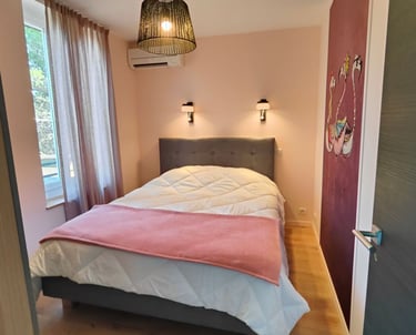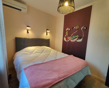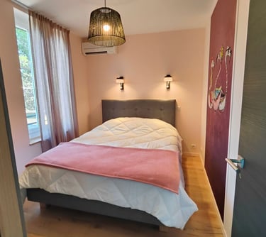 La chambre "amis" : lit double 160/200 avec sommier et matelas hauts, tête de lit et une armoire. Moustiquaire sur la fenêtre. Climatisation réversible.