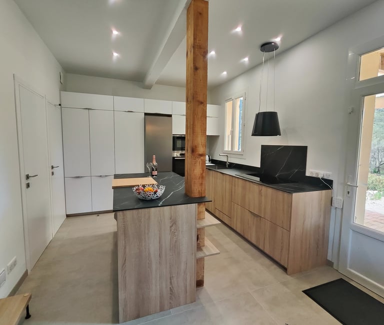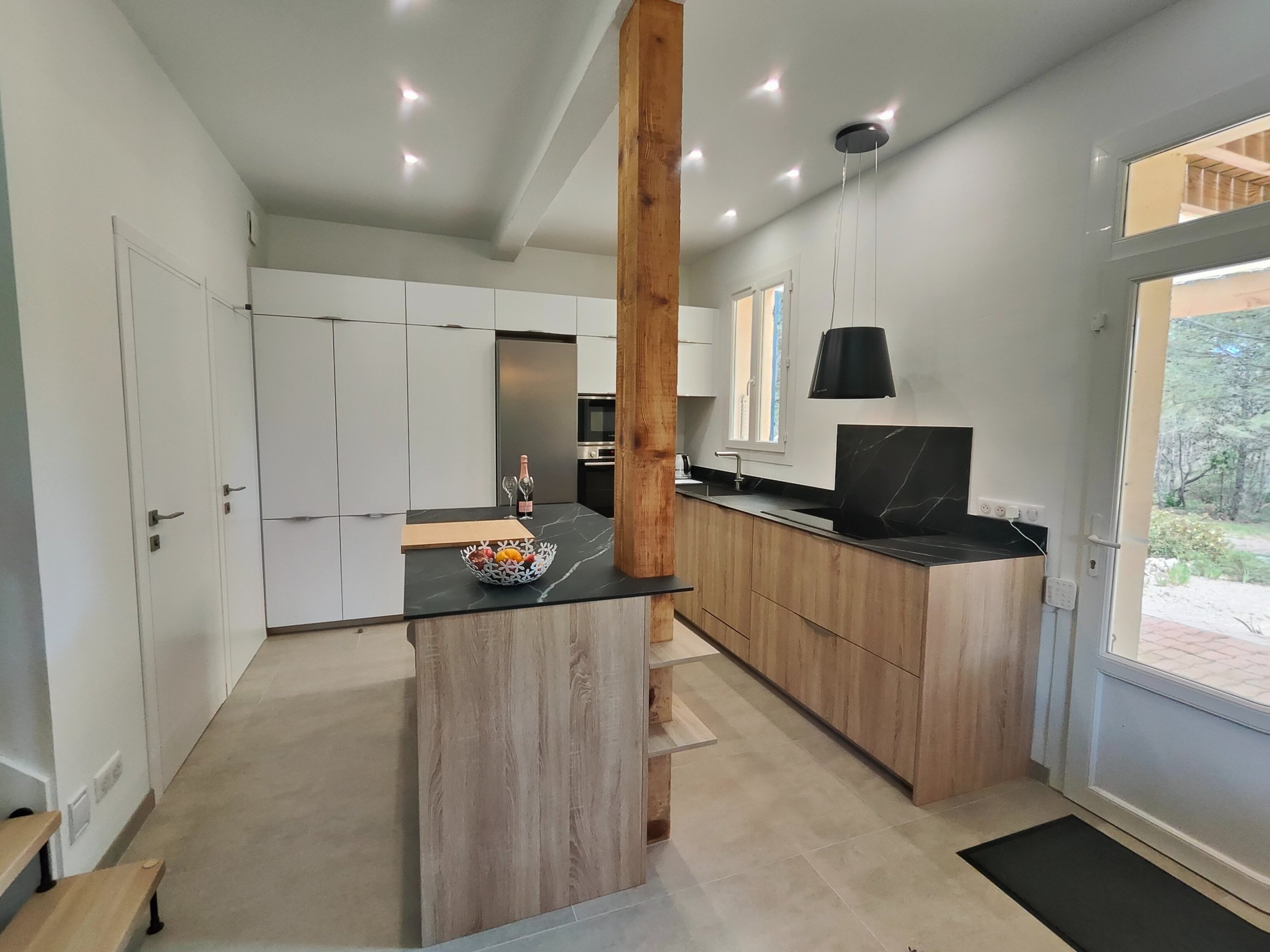 Une grande cuisine totalement équipée ; de grands placards et de vastes meubles à tiroirs, un ilot spacieux, des plans de travail en pierre, un grand frigo, une plaque à induction 5 feux, un four chaleur tournante, un micro onde, un lave vaisselle et une cave à vin dans laquelle des bouteilles de la région (et un peu de champagne...) sont mis à disposition "à discrétion", et à prix cave.