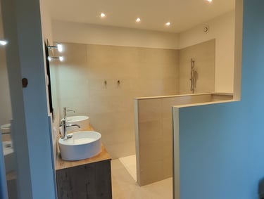 Une salle de bains (douche italienne et deux vasques) est indépendante du WC.