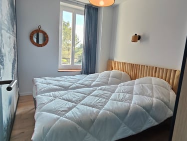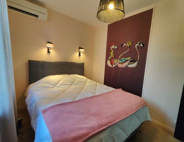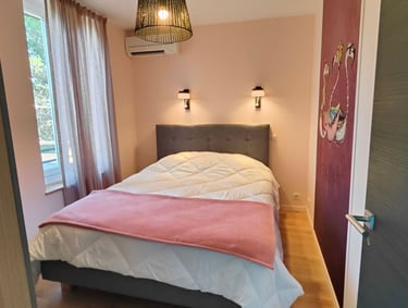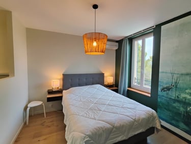 La chambre "amis" : lit double 160/200 avec sommier et matelas hauts, tête de lit et une armoire. Moustiquaire sur la fenêtre (vue mer et étang). Climatisation réversible.
