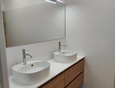 La chambre matrimoniale : lit double 160/200 avec sommier et matelas hauts, tête de lit, deux armoires, une salle de bain avec une spacieuse douche à l'italienne, un meuble double avec deux vasques et un grand miroir, et un wc suspendu (vue pinède est). Moustiquaire sur la fenêtre. Climatisation réversible.